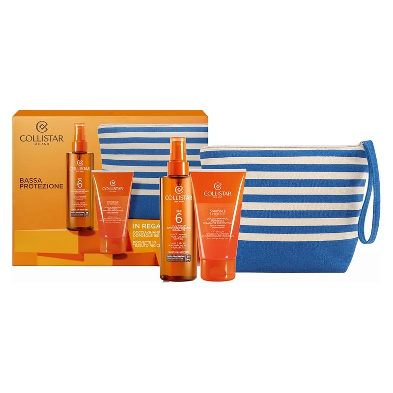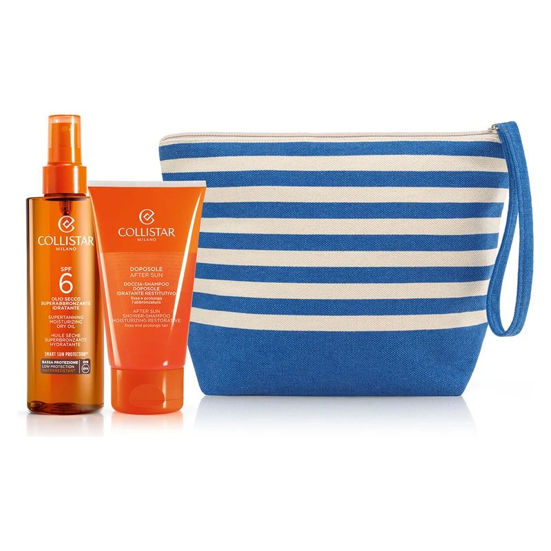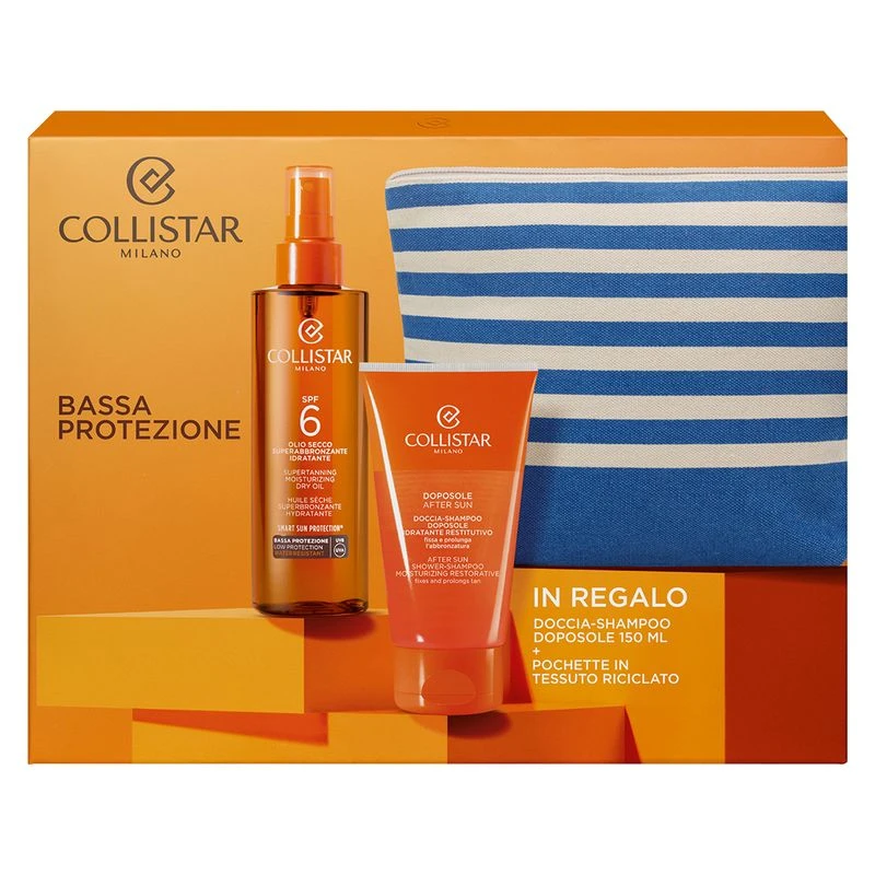Contiene: Olio Secco Superabbronzante Idratante SPF 6 da 200 ml + Doccia-Shampoo Doposole Idratante Restitutivo da 150 ml + Pochette