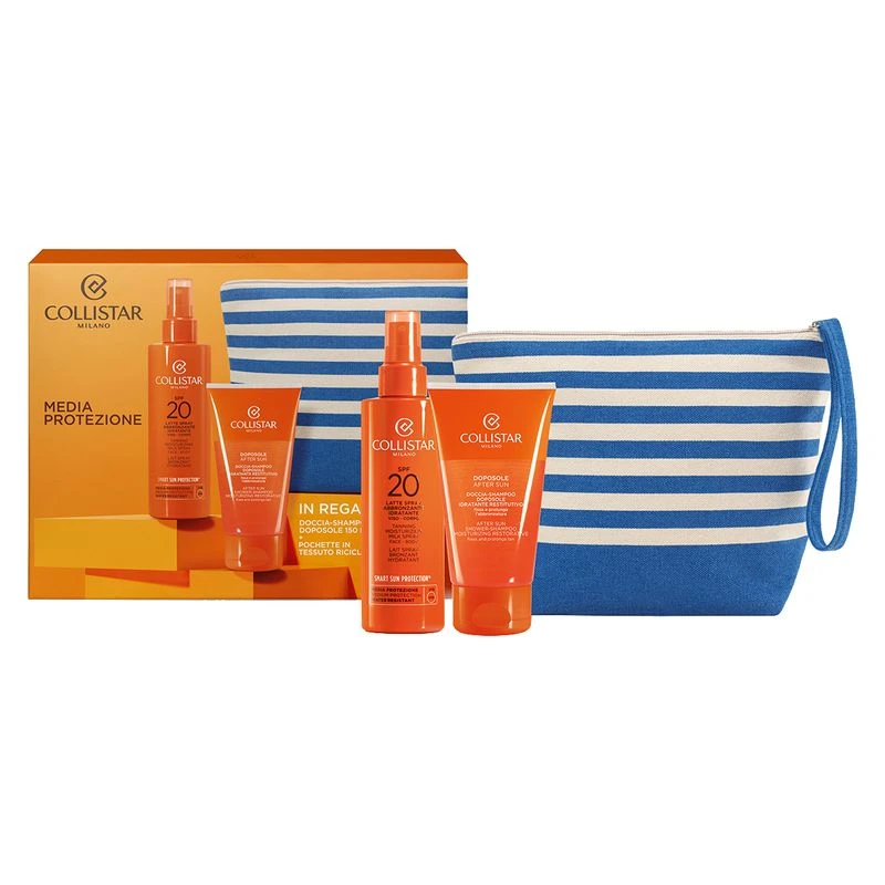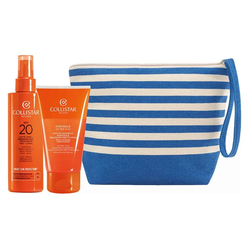 Contiene: Latte Spray Abbronzante Idratante Viso-Corpo SPF 20 da 200 ml + Doccia-Shampoo Doposole Idratante Restitutivo da 150 ml + Pochette