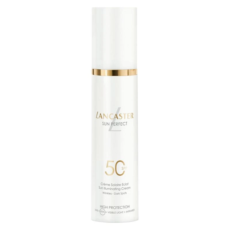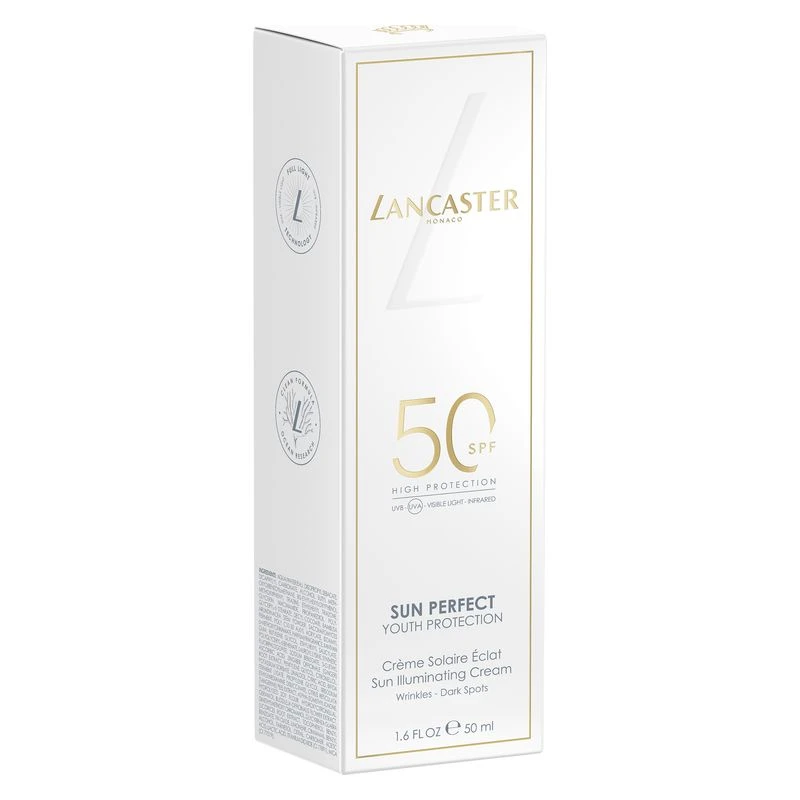 La formula avanzata di Sun Perfect Sun Illuminating Cream SPF 50 offre l’esclusiva e avanguardistica Full Light Technology di Lancaster, che contrasta il 100% dello spettro solare*, insieme alla Anti-ageing Technology, al Sun Repair System di origine naturale e al Glow Booster Complex.